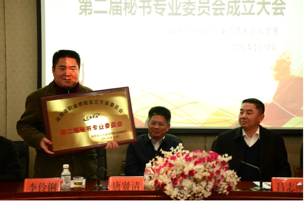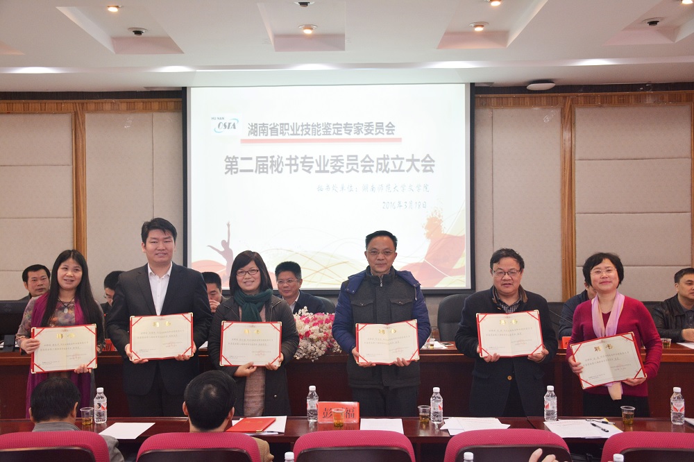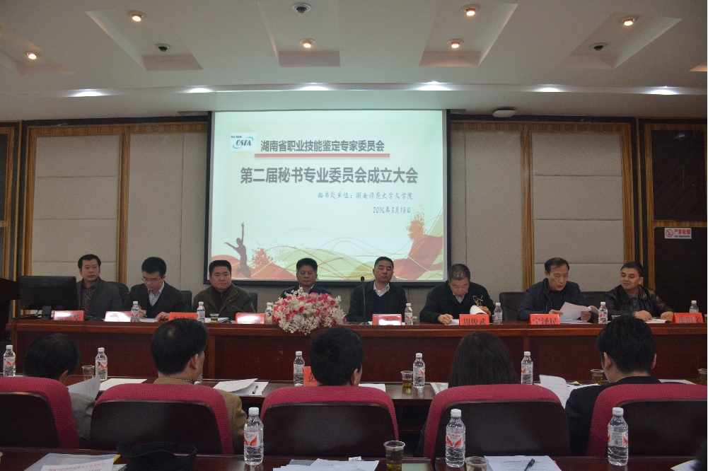 (通讯员 贺炳桂 尹诗慧 刘师好 梁鑫)为推动全省秘书学科建设,共商秘书专业与技能发展大计,3月18日上午,湖南省职业技能鉴定专家委员会第二届秘书专业委员会成立大会暨研讨会在湖南师范大学文学院隆重召开。湖南省人力资源与社会保障厅(以下简称“省人社厅”)副巡视员吕志纲,湖南师范大学副校长周俊武,湖南师范大学纪委书记唐贤清,省人社厅职业技能建设处调研员宁泽民,湖南师范大学文学院党委书记李伶俐,湖南师范大学文学院副院长岳凯华、彭万福等出席会议。会议由湖南省人社厅职业技能鉴定中心主任吴开明主持。