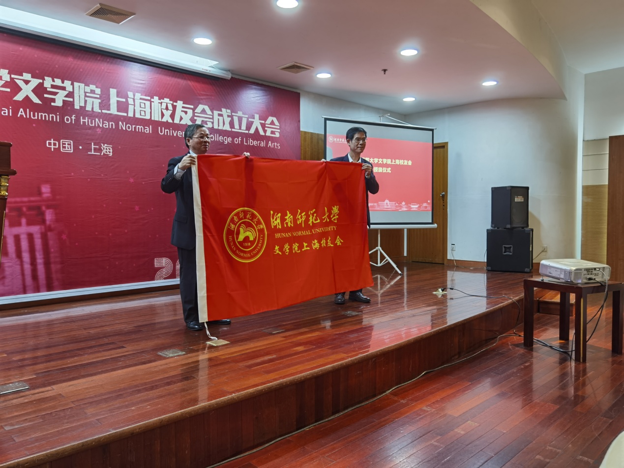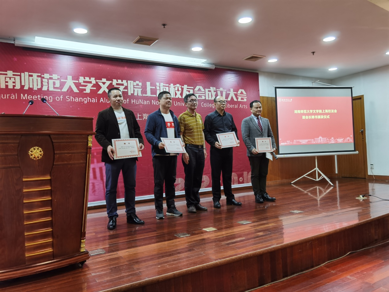 梁勇秘书长向黄力之会长授会旗,学校出席代表与上海校友会代表向文学院上海校友会理事成员颁发聘书。